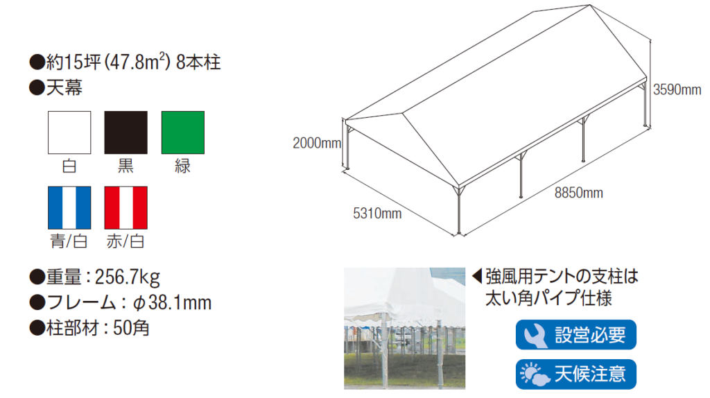 商品詳細 集会用テント 3K×5K 強風用 品番 6013306100 レンタル価格(税込み) 2泊3日 37,400円 カテゴリ テント|テント 数量 カートに入れる この商品について問い合わせる レンタルガイド